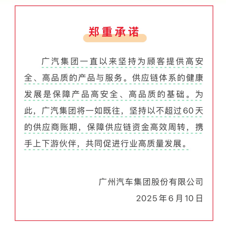 广汽集团表示,自1997年成立以来,广汽集团始终坚持“不超过60天供应商账期”的支付原则,至今已严格执行28年,以实际行动践行企业责任,维护供应链稳定。广汽集团已建立起覆盖订单下发、验收入库、对账结算到货款支付的全流程管控体系,并依托数字化平台实现全过程可视化管理,杜绝任何形式的支付拖延。
